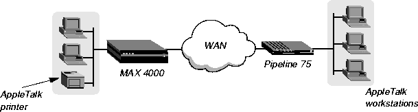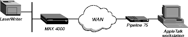 Figure 2 shows a typical AppleTalk connection. The AppleTalk workstation is part of an Ethernet LAN connected to a Pipeline 75, which has a synchronous PPP WAN connection to a MAX 4000. One of the MAX 4000 ports is on a LAN that includes an Apple Laserwriter printer. Following is a brief, generalized description of how the workstation sends a file to the Laserwriter for printing: