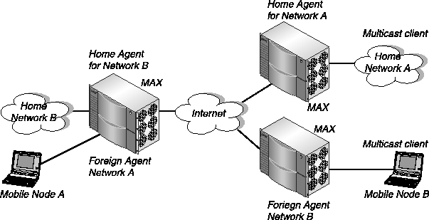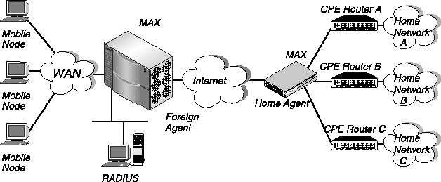 You can configure the MAX to act as a home agent or a foreign agent on a tunnel-by-tunnel basis. A typical network topology appears in Figure 7-4.