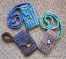 A small purse (5" x 3" x 1") for keeping your Palm Pilot warm or for carrying those indispensables (poker chips, spare diamonds, ....). It's a micro project for trying out the delights of felting. Size: To fit Palm Pilots, Treos, Blackberries, glasses, a large wad of money, etc. Yarn: Celestial BFL Aran. Techniques: Knitting in the round, fulling or felting (optional). Level: Intermediate. Pattern:$6.00 Cdn. Kit: $16.00 Cdn. Kit contains pattern plus Celestial BFL Aran, 20g each of two colours. Choose from: African Violet/Aquamarine (top) OR Aquamarine/Tequila Sunrise (lower right) OR African Violet/Bitter Chocolate (lower left). Other combinations available by request. |