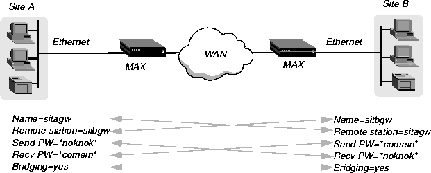 Note: The information exchange illustrated in Figure 8-1 differs slightly for Combinet bridging, where the bridges' MAC addresses are exchanged instead of station names, and passwords may be configured as optional. Otherwise, the way in which the MAX establishes a Combinet bridge connection across the WAN is very similar to the PPP bridged connection shown above. For more information about Combinet, see Chapter 3, Configuring WAN Links.