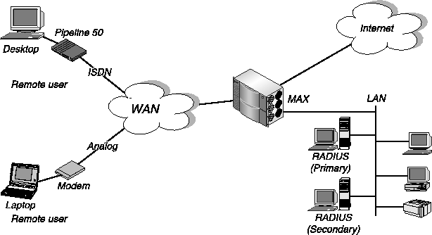 In Figure 1-2, a service provider or corporate office has a second RADIUS server acting as a backup. If the primary RADIUS server fails, the MAX automatically contacts the secondary RADIUS server to authenticate a user. If the secondary server fails, you can bring in a third RADIUS server as a backup. You can use the secondary server as a backup accounting server as well.
