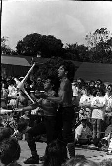 Variety In Motion was the Baltimore duo of Rick and Mardene Rubbio (they no longer perform together) who, as past People's Choice winners, were natural audience favorites. They did a six-torch passing routine on six-foot unicycles complete with variations by Rick. On the ground they did a dynamite, up-tempo passing routine choreographed to music. They move from this to a three-club stealing routine with lots of interesting steals (from both sides and below) as well as drop backs. Their show was very tight, well rehearsed and effective.