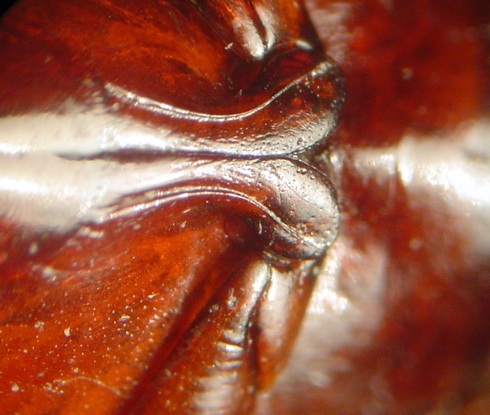 The specimen is 8.5 mm in length and is a uniform dark rufous in colouration. Note the deeply sulcate prosternum and prosternal process and the broadly emarginate anterior edge of the clypeus which are characteristic of this genus. The mextacoxal plate is micro-reticulate (not really visible in the photograph below) which helps distinguish this species from others in the genus. There are only four species in this genus which is restricted to North America. Only one other species (M. bicarinatus Say) has been recorded in Canada.