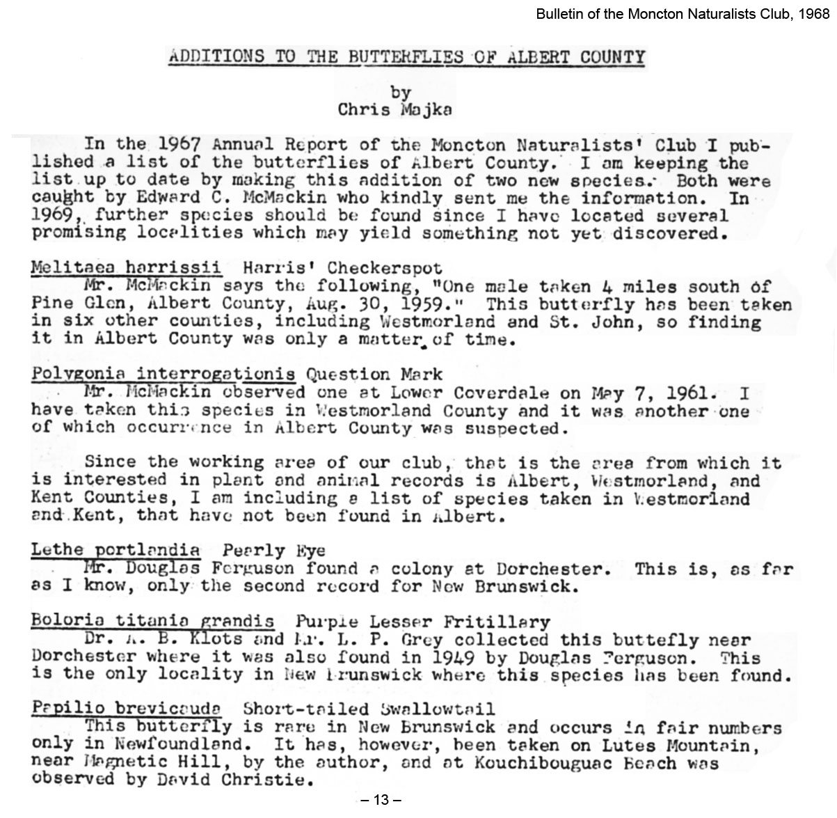 - The butterflies of Albert County. Bulletin of the Moncton Naturalists Club 1967: 13-20.