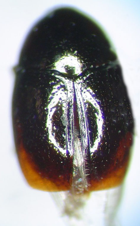 Length 1.7-2.2 mm; Pronotal & abdominal microsculpture usually invisible at 90x magnification; antenomere 3 distinctly shorter than 2 or 4. Black brown to black with apical portion of elytra paler. - Baeocera congenera Casey