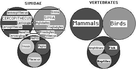 Sound complicated and strange? Well in all fairness to MacLeay and Swainson it was, in some respects, as good an idea as any other at this time when there was as yet no conception of a driving force behind any scheme of relationships. It was not until Darwin, and the idea of evolution, that a dynamic sense of taxonomy would start to be created. The following example is one of Swainson's illustrating the relationship of monkeys according to the Quinary system. The straight lines indicate 'analogies', that is, animals which are in some way representative of the same qualities although they are in separate circles.