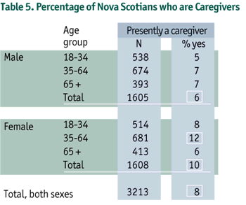 Eight percent of Nova Scotians (10% of females and 6% of males) reported being caregivers. Women age 35-64 years were most frequently identified as providing this assistance (12%) (Table 5).