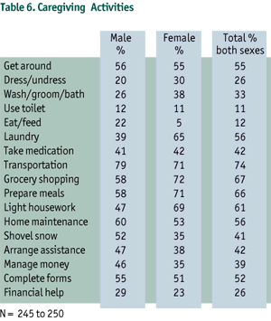 Female caregivers helped most with personal care activities such as washing, grooming, and bathing, as well as domestic chores such as laundry, grocery shopping, meal preparation, and light housework. Males helped more often with transportation, home maintenance, snow shovelling, and money management (Table 6).