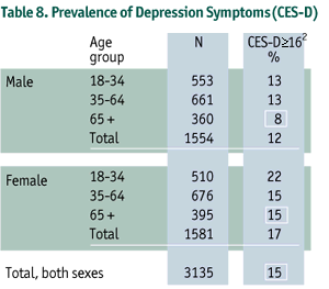 Further assessment of individual well-being was examined with responses to statements designed to measure symptoms of depression. Those at risk for depression (CES-D > 16), represented 15% of the population; and these results were most common in young women age 18-34 (22%). Older men were least likely to show symptoms of depression.