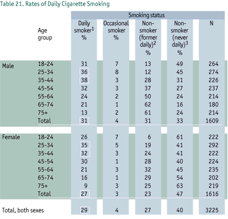 One-third of Nova Scotians were smokers. Overall, more men than women were daily (1 or more cigarettes/day) and heavy smokers (25 or more cigarettes/day) (p < 0.05). Twenty-nine percent of adults were daily smokers, and the highest prevalence for both sexes appears to be in the 25-44 age range (Table 21). Of the daily smokers, 34% were heavy smokers and the greatest percent were men age 45-54 (Table 22)