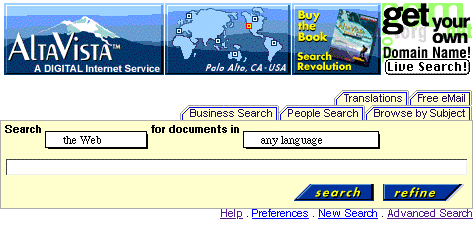 AltaVista est un véritable outil de recherche. En combinant ses propres web spiders (des programmes qui parcourent le Web à la recherche de sites à indexer) et les requêtes des internautes, il tient à jour un vaste index. Vous soumettez un terme à rechercher et Alta Vista vous retourne une liste des sites correspondant à votre requête, par ordre de conformité.