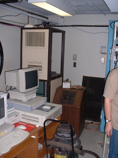 Photo: Dead air conditioner An aging air conditioning tower in the machine room hosting the Chebucto Community Net has finally failed for good. Dalhousie has brought in a loaner air conditioner (the brown box to the right of the tower) used as a summer cooler for a staff lunchroom while waiting for the new tower ordered by the Dal Math and Stats Department to arrive.