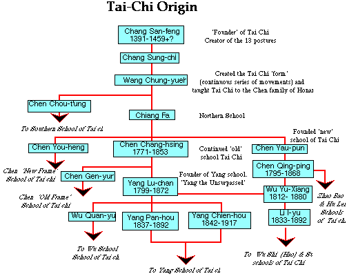 His theories, writings and practices were elaborated sometime later by Wang Chung-yueh and his student Chiang Fa. Wang apparently took the thirteen postures of Chang San-feng and linked them together into continuous sequences, thus creating something which resembles the contemporary Tai Chi Chuan form. His student Chiang Fa taught Tai Chi to the villagers of a town on Honan (almost all of whom were called Chen) and thus began the first family school of Tai Chi Chuan.
